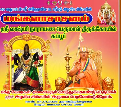 Sri 46th Azagiya Singer is kind enough to inform us that he would be visiting our temple ‘SRI LAKSHMINARAYANA TEMPLE’ situated at Kappur village, adjacent to Vilupurm district in Tamil Nadu on January 4, this year at about 4.00 pm for Mangalasasanam and Dolotsavam. He would be accompanied by his disciplines from the adjacent Padur […]